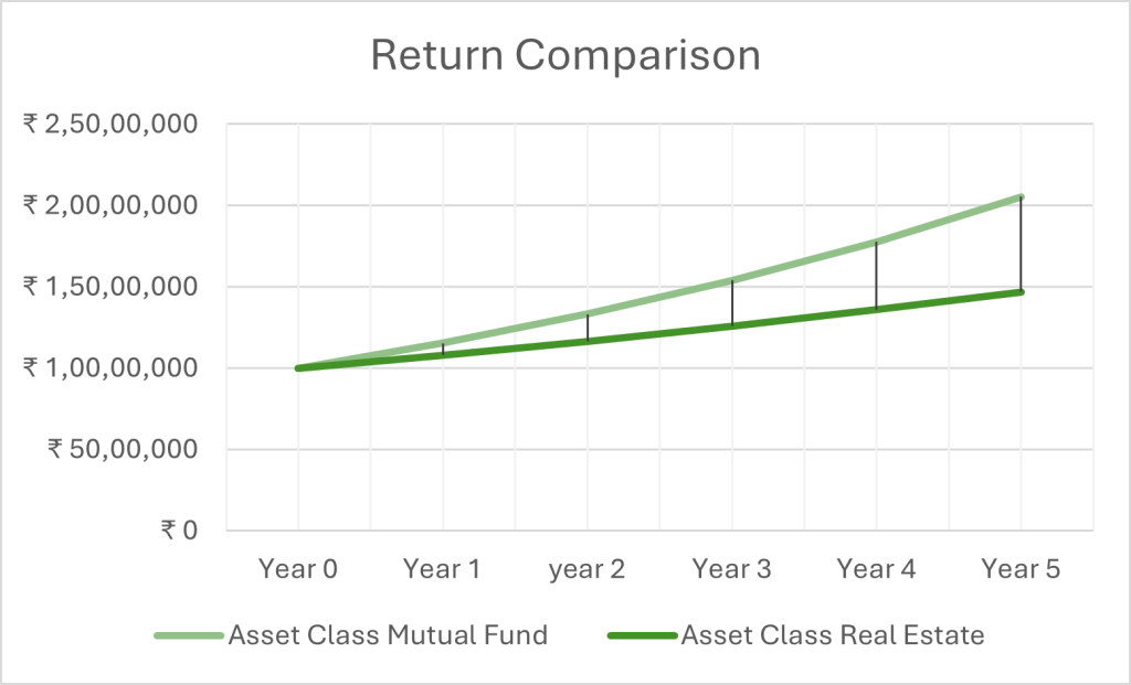 Let’s consider a comparative analysis of the returns on ₹1 crore invested in real estate versus mutual funds over the last five years. According to AMFI data, equity mutual funds have offered an average return of 15.48%. Meanwhile, property prices in cities like Delhi, Chennai and other metro cities have seen only a 6-8% annual appreciation. We must also factoring in the transaction costs, maintenance and property taxes in the real estate.